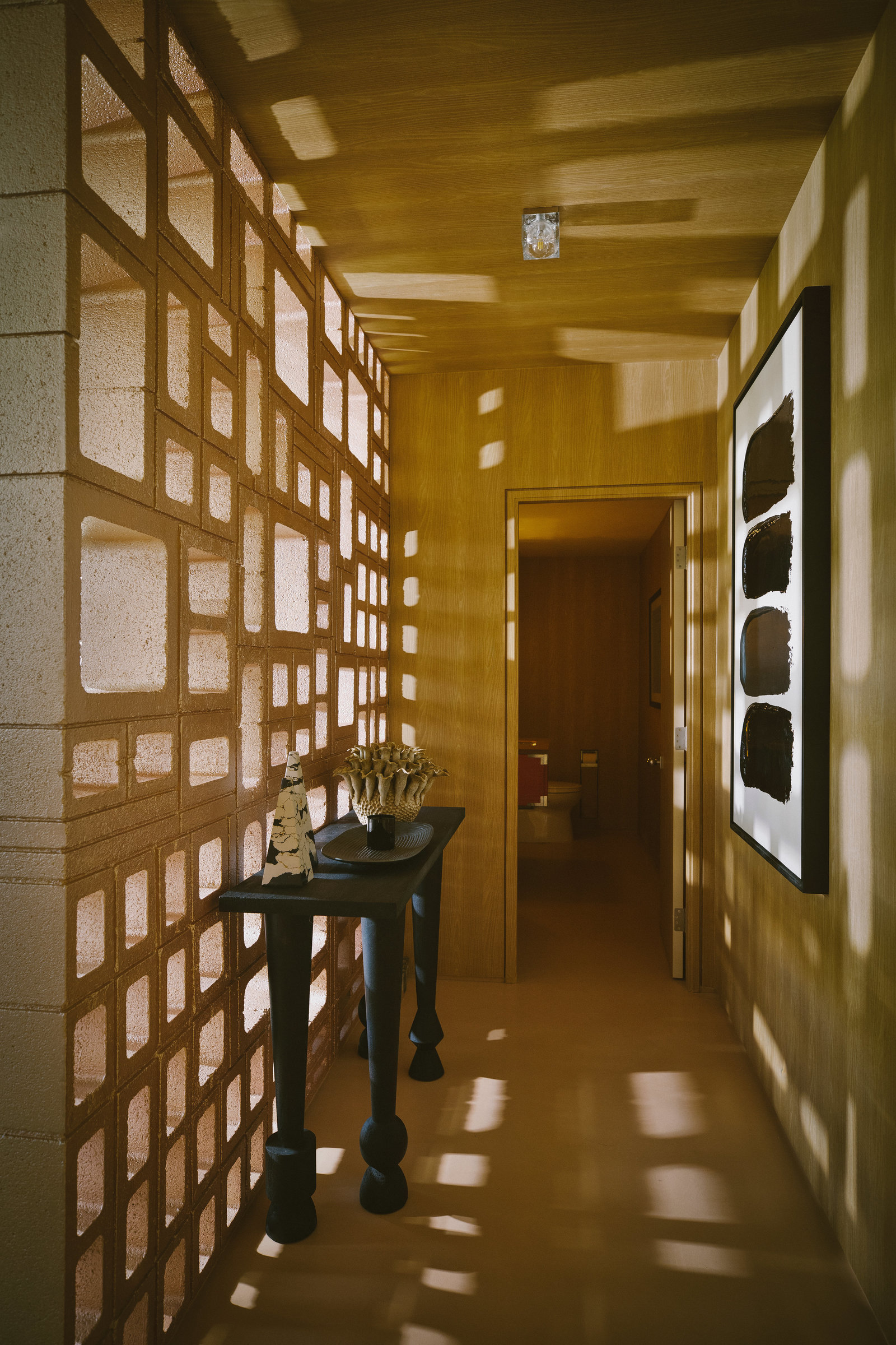 Every detail was chosen with intention. Hand-placed breeze blocks create sculptural walls that filter light and air. The silver-glazed tile roof reads like a Spanish spaceship. Metallic surfaces shift with the desert sun. Custom window treatments, recessed lighting, and high-speed data wiring throughout ensure modern functionality within the artistic vision. The property includes two-car garage with seven total parking spaces, automatic gate with card/code access, owned security system, and solar panels.