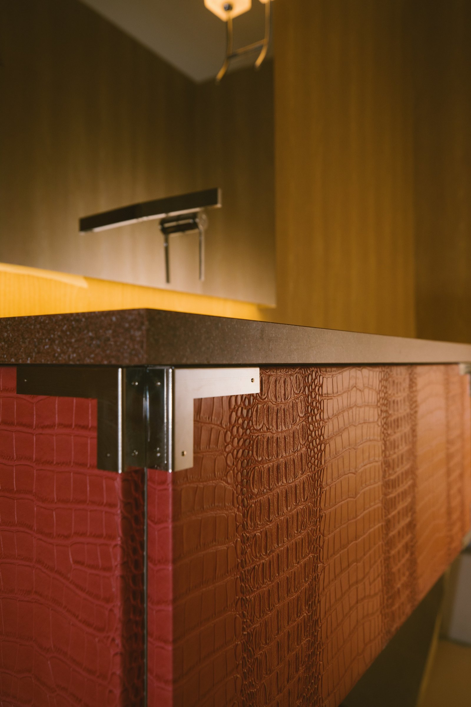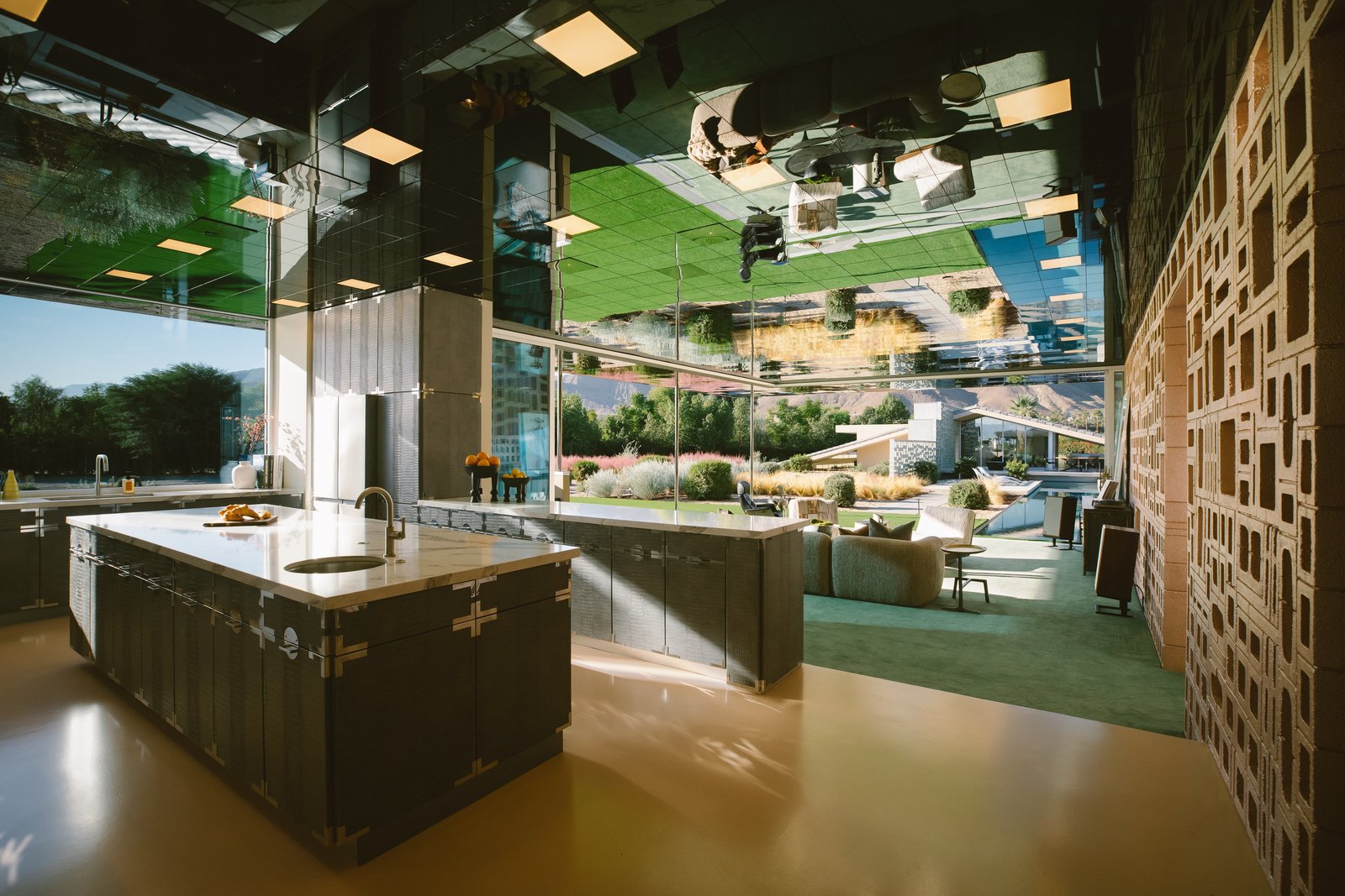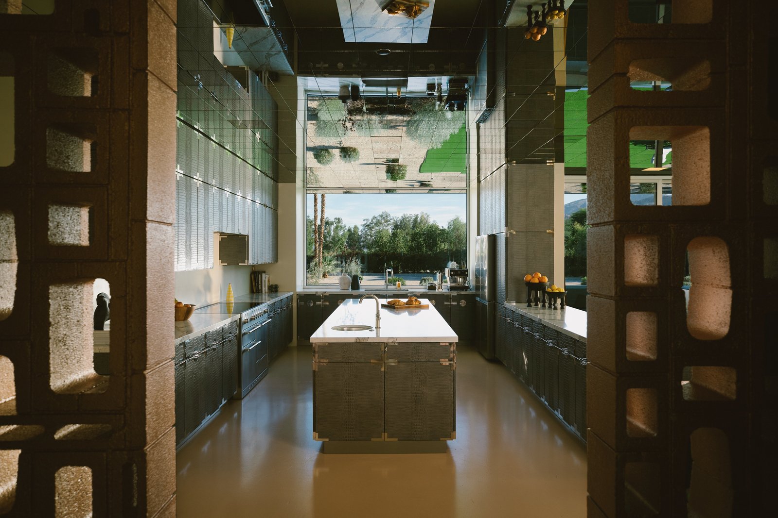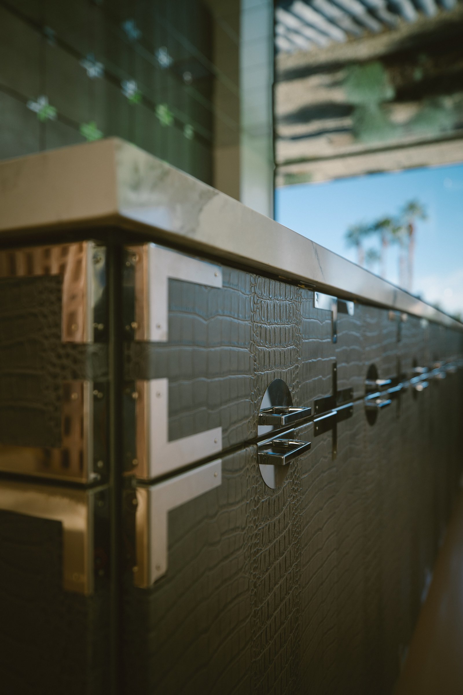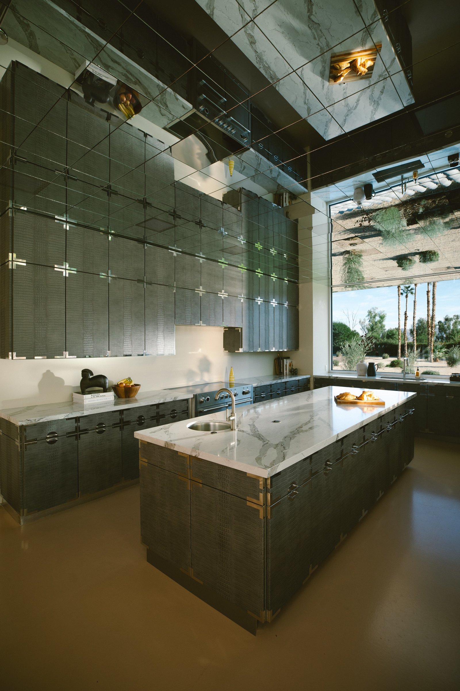 The kitchen defies convention with crocodile-embossed "leather" cabinetry inspired by Japanese tansu and Prada's aesthetic, bespoke stainless hardware, and marble counters. A second kitchen ensures effortless entertaining. Windows flood the space with desert light, while the breakfast bar and kitchen island provide multiple zones for gathering.